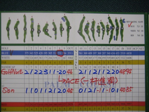 那天,青春少艾的兒子和我先打完後九洞後以四十比四十八的杆數遙遙領先。他九個洞能打出兩支柏蒂(-1),我倒是打出四支雙博忌(+2)。