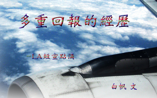 其實,我的回報從上飛機的那一刻就開始了。我與四位同工乘坐同一趟飛機,我納悶,為什麽我們同時訂票,共坐一排,我的機票卻為什麽會最便宜呢?我為什麼常常得到神特別的恩典呢?