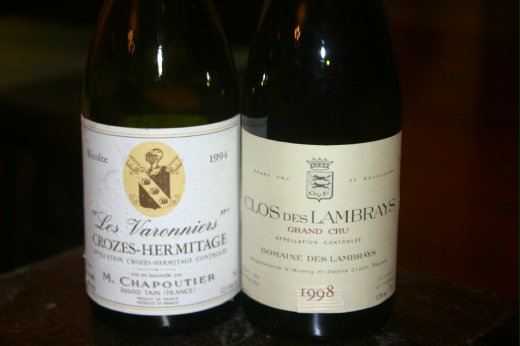 由於Clos des Lambrays 1998的表現不如預期,意猶未盡的我們又加開了一隻Thomas大哥在去年推薦的酒:Chapoutier的Crozes Hermitage les Varonnieres 1994。這隻酒倒出來時顏色深黑,且瓶底的酒渣已不少,橡木桶的氣味十分明顯,底層的果香味隱約可辨;不過果香與橡木桶氣味混合的結果,反而形成一種類似肥皂水的或是洗衣粉之類的氣味。之後原本沉在底層的果香逐漸浮現,香氣逐漸散發出來。橡木桶的燻烤味仍然明顯,但多了一絲香料及一些不知如何形容的甜美氣味。入口後有些spicy的hint,酒體算是厚實型的,骨架不差,單寧十分細緻,餘韻帶有一些奶油味,以及一絲絲甘味,不過在長度上不如前一隻酒。整體而言這隻酒不差,但似乎在變化度上並不是那麼的豐富,經過約兩個小時還是原地踏步,並未有進一步發展。當天由於時間已晚,朋友明天還有正事待辦,因此並未給它多些展現自己的時間,或許我們該更有耐心一些?