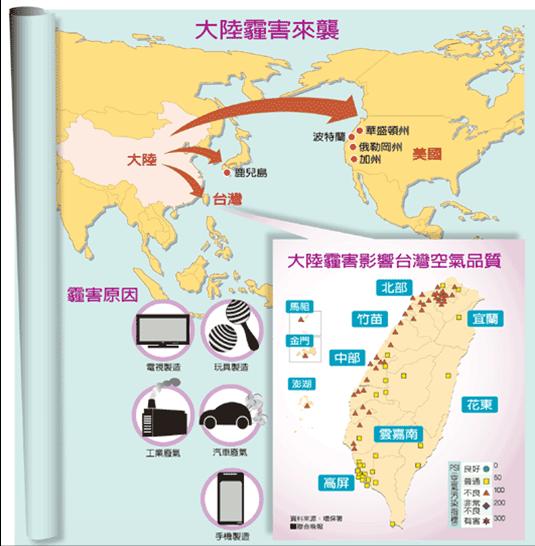 台灣位於中國大陸 東南邊陲,受到東北計季風影響很大,不管你關不關心中國大陸的事務,中國大陸的風吹草動都影響到世界及台灣,以往中國大陸的酸雨及沙塵暴(圖1~圖3)都給台灣一定的影響,最近愈來愈嚴重的霧霾當然也對台灣造成影響(圖4~圖6),另一方面對於霧霾的防制設備及口罩過濾裝置又給台灣提供了賺錢的商機,政府相關官員不可不注意。
