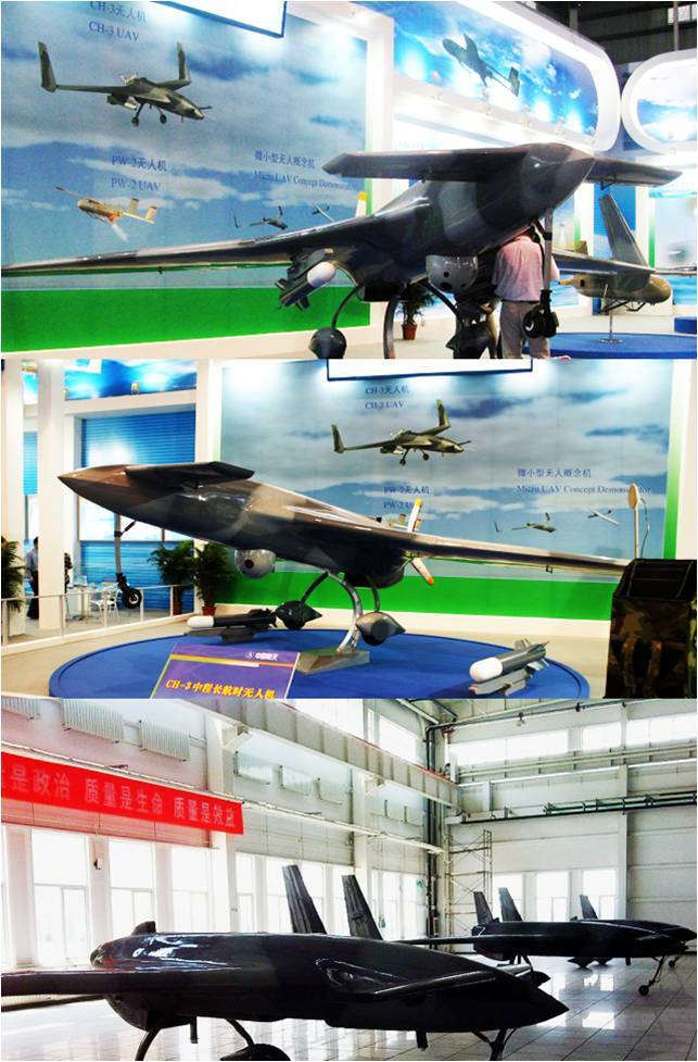 彩虹-3(CH-3)無人機是由中國航天科技集團公司自主研發,是一種由無線電遙控設備或自身程序控制裝置操縱的無人駕駛飛行器。彩虹-3中程無人機系統的主要裝備包括:中程無人機、地面車載遙控站和地面保障設備。彩虹-3無人機採用的是活塞發動機,最遠航程能達2400公里,巡航時間可達12小時,其間無須加油。該飛機裝有照相、攝影裝置,可作偵察机使用。彩虹-3無人機採用輪式自主式起降、起飛重量640千克、載荷能力60千克、飛行時間12~15小時、飛行高度5000米、最遠航程2400公里。這些性能指標都表明彩虹無人機達到國際水平。彩虹-3無人機體型較大,其翼展8米,機長5.5米,可携帶光電偵察設備甚至AR-1型空地導彈;巡航高度3000至5000米,最大升限6000米,較普通無人機更優秀;配備3點式起落架,可以從跑道起飛,而其他無人機通常只能彈射起飛;彩虹-3掛載的AR-1型空地導彈,是世界頭一種專為無人機開發的類似武器,類似著名的美製“小牛”導彈,採慣性加GPS複合制導,重量僅45公斤,彈頭裝有6.8公斤高能混合炸葯,最大破甲厚度为1.4米。“彩虹-3”掛載這種對地攻擊利器後,完全可以打擊敵方坦克、固定工事等目標。