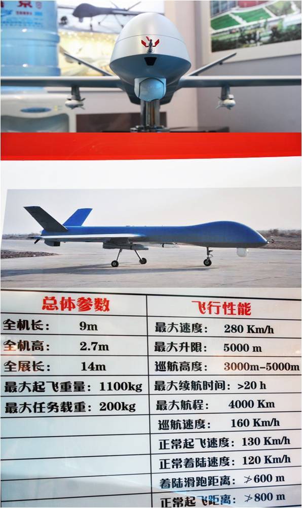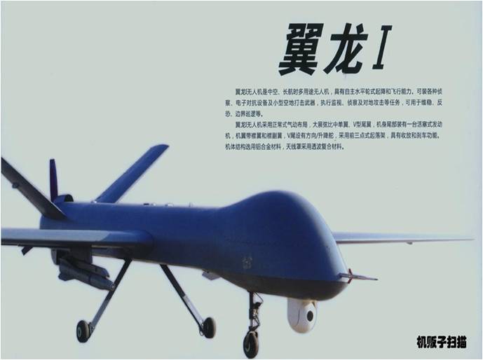 翼龍無人機是中國成都飛機設計研究所研製的中低空軍民兩用,長航時多用途無人機,裝一台100馬力活塞發動機,具備全自主平輪翼龍無人機式起降和飛行能力。可携帶各種偵察、激光照射/測距、電子對抗設備及小型空地打擊武器。可執行監視、偵察及對地攻擊任務,也可用於維穩、反恐、邊界巡邏等。此外,翼龍無人機也可廣泛應用於民用和科學研究等領域,如災情監視、緝毒走私、環境保護、大氣研究,以及地質探勘、氣象觀測、大地測量、農藥噴灑和森林防火等。翼龍無人機採用正常式氣動布局,大展弦比中單翼,V型尾翼,機身尾部裝有一台活塞式發動機,機翼帶襟翼和襟副翼,V尾没有方向/升降舵,採用前三點式起落架,具有收放和刹車功能,機體結構選用鋁合金材料,天線罩採用透波複合材料。依數據來看,該機性能酷似美軍著名的“捕食者”無人攻擊機,捕食者”無人攻擊機以善於在伊拉克和阿富汗製造“斬首行動”而聞名。據了解,翼龍雖然性能不亞於美軍“捕食者”,但價格卻遠低得多。