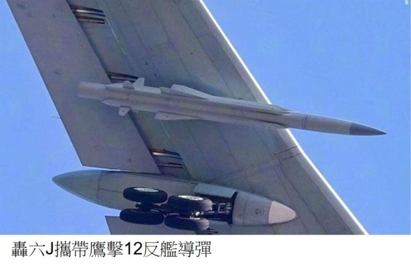 如果轟六J掛載鷹擊12的話,每架轟六J據稱可以在兩翼下一共掛載多達6枚,還有一枚可以掛載機腹彈艙內。一個轟六J轟炸機團共有24架,一次可以向一個目標發射多達168鷹擊12,這樣大的超飽和攻擊,按美國現有的航母編隊只能防禦30至40枚的水平,一個轟六J的攻擊能力可以達到攻擊三個以上美國航母編隊的能力。解放軍已高調派出H-6G電子攻擊機和H-6航母攻擊機在南海演習,就是要威嚇美軍。共軍專家稱,反艦導彈一般部署在沿岸或軍艦上,各有優缺點。缺點是從岸邊發射,射程有限;從艦上發射,又因軍艦航行速度慢,快速反應能力受限。現在改變戰術從空中平台發射,其威懾能力、快速反應能力更高。至於選擇轟六是因轟炸機比戰鬥機航程遠、掛載能力強。