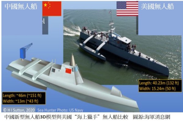 無人水面艦艇是繼無人機後又一影響戰爭的新武器,海軍艦艇非常昂貴,而且台灣買不到神盾級的新式戰艦,美國賣給台灣高價的古董艦自己卻拿去當靶船。這些老艦事實上無法對抗解放軍,政府要自製潛艇事實上困難度很高且是一個錢坑,而無人艦成本低,又無戰士生命之憂值得大力發展。美國正在構建空海無人化聯動體系來加強海上戰力,台灣也可以藉發展無人艦提升國軍戰力。近日中國無人艇成功首航引起外媒關注,同時美國海軍也準備打造多達150艘無人艦隊。中國的無人艇採用三體船型,排水量約200噸,最大航速20餘節,自2015年底起開始研製工作,於2019年8月28日在江西九江下水。以色列《耶路撒冷郵報》稱,這艘200噸的無人艇類似於美國“海上獵人”號無人艇和“朱姆沃爾特”級驅逐艦的混合體,近日它剛在中國浙江省舟山近海完成3小時的首航。特點是依靠人工智能,具備自主導航能力。印度《歐亞時報》稱,中國新問世的無人艇可能為中國海軍未來採用分佈式作戰和集群作戰等新的海戰戰術鋪平道路。