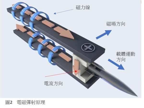 電磁發射的基本原理就是通電的導體在磁場中會產生運動即物理中的法拉第定律,和普通的電動機差不多但是結構有差異,主要有(1)軌道發射技術(2)線圈發射技術(3)重接發射技術。三種發射技術中軌道發射技術結構最簡單,但實用是最難的,線圈發射技術次之,但要達到超高速很難。而重接發射技術難度就比前兩者都要高一些,但在重載發射能力上它是最強大的。圖2是軌道彈射的原理,導軌就是電極,電流方向由正極流向負極,發射彈頭有一個導電的電樞,通電時電流從導軌穿過電樞從另一條導軌回到電源構成一個迴路,根據物理上安培右手定則,電流通過導體會產生環形磁場,根據法拉第左手定則,這個磁場將驅動電樞上通過的電流,推動電樞往右方前進,在小電流下這個驅動力並不明顯,但在百萬安倍的電流下就會變成巨大的推動力,將電樞加速到數千米/秒。但是軌道發射不僅要有超級電源,還要有防燒蝕的導軌技術。線圈炮的原理則是利用線圈產生的磁場吸引中間的“彈丸”,將其持續加速,並且可以通過多級將其不斷加速,達到比較高的速度。但這個線圈發射原理有個缺點是中間的鐵磁物體磁通容易飽和,阻礙了速度的進一步提高。重接發射原理有點像線圈炮,不過線圈炮是線圈中心通過發射物,而重接炮則是線圈的中軸線垂直方向發射,兩個線圈的磁場通過導線將磁場“重新連接”起來,所以被稱為是“重接炮”。重接發射有一個優勢,可以用多個線圈並聯加速,簡單了說就是可以將發射物體的重量加大,可以發射高速重載的物體,比如電磁彈射就是屬於重接發射原理的一種,它能將30~40噸的物體在2-3秒內加速到飛機的起飛速度。從公佈的央視視頻中可以發現發射的電磁軌道是雙排的,表示兩條軌道同時加速的。電磁彈射其實非常複雜,因為涉及到儲能以及超高功率的強迫儲能與輸出發電系統、彈射導軌及其冷卻系統、超高功率的變頻器與控制系統、電磁干擾屏蔽系統等。