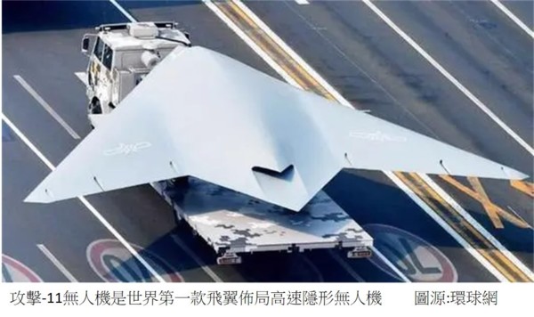 中國的隱身無人機攻擊-11近期在北京博覽會展出,央視報導稱其能執行與空中優勢有關的任務。央視表示,它不僅可以高空飛行,還可以像殲20隱形戰鬥機一樣在高危險環境中執行空中優勢奪取和壓制任務。這是中共官方媒體首次披露攻擊-11 能奪取制空權。由於隱身飛機可以深入敵方防空系統後方,因此可對敵方機場基地執行精確打擊,這樣敵人將不得不放棄空中優勢,因為他們沒有飛機在空中飛行。隱身性能是五代機最重要的特點,隱身無人機如虎添翼在現代戰爭中有如一把利劍。中國的攻擊-11無人機具有隱身特性,在台海爆發戰爭時能對台灣的空防能力構成重大威脅。攻擊-11以前被稱為“利劍”已服役至少兩年,於 2019 年在中國閱兵式上推出。