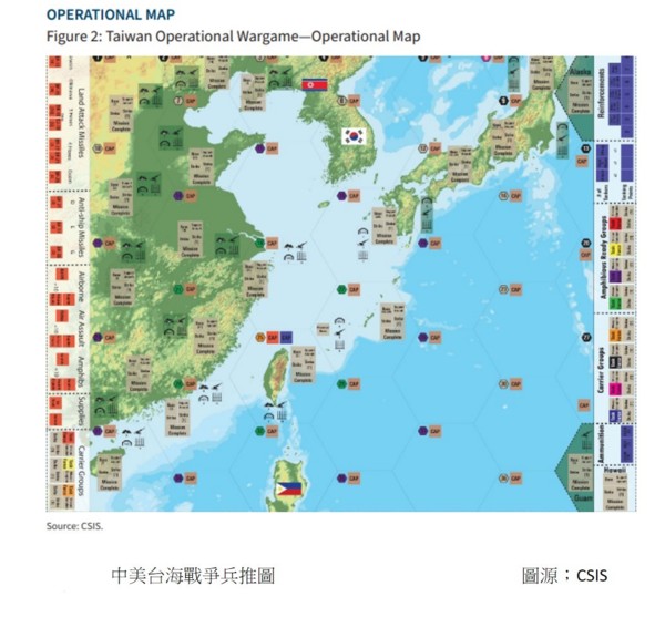 戰略與國際研究中心 (CSIS)是一個美國兩黨合作的非營利性政策研究機構,致力於推進實用理念以應對世界上最大挑戰的組織。CSIS 學者將他們的政策專業知識、判斷力和強大的網絡用於他們的研究、分析和建議,有助於美國作為關鍵決策者的決策參考。最近,CSIS兵棋推演解放軍在2026年入侵台灣,結果顯示美軍將「慘勝」,台灣則會被摧毀到無電可用。兵棋推演的結果雖懷有政治目的而不能全信,但兵棋推演細節卻可供軍事評論參考。美國試圖把台灣變成豪豬與解放軍拚巷戰以大量消滅中共國力,但台灣不是烏克蘭,兩岸同胞無深仇大恨又是同一民族,要台灣人民當美國砲灰不易被多數人接受。CSIS有一個重要假設就是在武統戰爭時,台灣必須抵抗到底不能投降。如果台灣投降,其餘美日軍事行動都是徒勞無功的。台海戰爭代價極高,美日損失數十艘軍艦、數百架戰機和數以千計的軍人,這種損失將損害美國的全球霸權地位。美國兵棋推演要戰勝解放軍的分析顯示須有四個必要條件:(1)台灣軍隊必須死守陣地,然而台灣部隊人少、士氣不高又訓練不足。因此,台灣必須充實兵員並進行嚴格的聯合武器訓練,陸軍必須成為台灣防禦工作的中心(2)台灣沒有“烏克蘭模式”,CSIS建議:和平時期,美國必須提供台灣所需武器; 戰時,美軍必須迅速進行直接戰鬥以保衛台灣。烏克蘭與北約國家有接壤,俄羅斯無法阻止陸路運輸資源給烏軍。 然而台灣是孤島,若解放軍封鎖台灣則無法得到外援。 台灣必須以其所需的一切開始戰爭(3)美國必須能夠利用其在日本的基地進行作戰行動(4)美國必須能夠從外部快速集中打擊中國艦隊。但這些條件在現實中很難達到,因此兵推有極大的誤區。