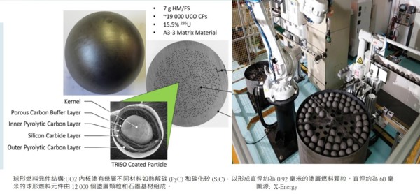 X-energy公司位於美國首都馬里蘭州羅克維爾郊外,該公司研發的高溫氣冷堆Xe-100與中國的HTR-PM原理一樣,構造也類似,但Xe-100冷卻爐心的氦氣送至蒸汽產生器再將高溫蒸汽送至汽輪機發電,而HTR-PM則是將冷卻爐心的氦氣直接送去推動轉子發電。兩種反應堆的功率不同,美國的尺寸及重量較小。球床式高溫氣冷堆的爐心不會熔化。Xe-100 是一種先進的模塊化反應堆,每個單元設計用於產生約76MW的電力。反應堆堆芯由石墨製成,填充有 15.5% 的濃縮燃料球。每個鵝卵石燃料丸包含數千個經過特殊塗層的三結構各向同性 (TRISO) 鈾燃料顆粒,這些顆粒幾乎堅不可摧。TRISO 塗層在鈾核周圍形成氣密密封。這有助於保留在操作過程中產生的裂變產物和氣體,並允許在距離工廠或市區 500 米的範圍內建造該工廠,因此緊急計畫區很小,發電站用地小。新鮮的鵝卵石連續裝入反應器內,氦氣通過鵝卵石床向下泵送,將熱量提取到產生電力的蒸汽發生器中。反應堆通過每天在頂部添加新鮮的鵝卵石來不斷補充燃料,因為舊的鵝卵石從核心底部排出。每顆鵝卵石在堆芯中停留三年多一點,並在堆芯中循環多達六次以實現完全燃燒。然後將乏燃料直接放入乾燥桶中並就地儲存——無需臨時或主動冷卻。Xe-100 設計用於在高溫下運行以更高效地發電,高溫氦氣還可用於目前依賴化石燃料的能源密集型工藝,例如製氫和石油精煉。這種反應堆概念還可以設計成在氦冷卻劑損失的情況下通過自然傳導、熱輻射和對流進行被動冷卻——這意味著它不必依賴大型本地水源、泵或安全系統來防止燃油損壞。優點有能夠負載跟隨可再生能源在使電網保持穩定負載。可持續添加鈾燃料和現場燃料儲存,提供高可用性 (93-95%),同時確保電廠彈性。建設時間短(300 MWe 電廠只需2.5~4年)。通過美國能源部的先進反應堆示範計劃, X-energy 獲得了 8000 萬美元的初始資金,用於在未來七年內示範一個四單元、320 MWe 的工廠。該公司的目標是到 2021 年完成其基本設計,並已在橡樹嶺國家實驗室現場的試點規模燃料設施中使用天然鈾成功製造了第一批燃料卵石。它是目前唯一一家積極生產 TRISO 燃料的美國公司,並獲得了美國能源部的額外援助,以設計商業規模的“TRISO-X”燃料製造設施,並在2021 年年中之前為該設施提交核管理委員會許可申請。該公司計劃在 2020 年代中期完成 TRISO-X 設施建設。X-energy公司成立於 2009 年,與美國的傳統技術選擇相比,Xenergy 致力於開發利用“本質安全且抗擴散的 TRISO 燃料”的球床式高溫氣冷堆。