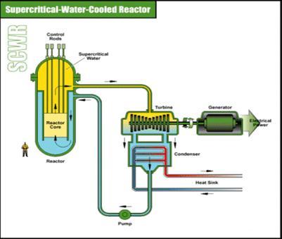 超臨界水冷堆(圖7)是六種第四代核反應堆中唯一以輕水做冷卻劑的反應堆,超臨界是在水的熱力學臨界點以上運轉的高温高壓水冷式反應器如圖7所示,超臨界水冷卻劑使其熱效率比目前輕水式反應器高出1/3,同時也簡化了其他BOP設備。由於冷卻劑在反應器中不發生相改變,且能直接與能源轉化設備耦合,所以核電廠BOP設備可大為簡化。也納入了非能動安全觀念,它是為高效率發電設計,在反應器設計的兩個選擇方案中提供了一種管理錒系元素的方案,可使用熱或快中子能譜,因此該系統提供了兩種燃料循環選擇,第一種是具有熱中子能譜反應器的開放循環,第二種是具有快中子能譜反應器的封閉式循環,由中心先進水處理系統支援全部錒系元素再循環。與目前水冷堆相比,它具有系統簡單、尺寸小、熱效率高、經濟性和安全性更好的特點。在巴黎召開的第四代核能論壇上,中國簽署了加入第四代超臨界水冷堆系統的協議。
