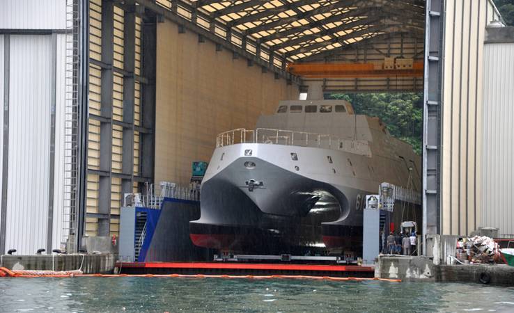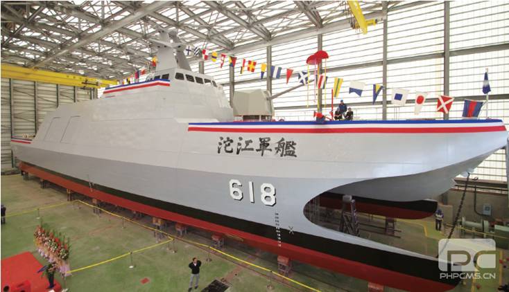 台灣自製的首艘匿蹤飛彈巡邏艦「沱江艦」12月23日舉行交艦典禮(圖1~3), 沱江艦是國內首艘匿蹤飛彈巡邏艦,採雙體船設計,特色是速度快、外形匿蹤。 沱江艦長60.4公尺、寬14公尺,最高速率達38節,滿載排水量約502噸,續航力2000浬,耐波力7級風浪,搭載41員,雖然僅500噸,可搭載包括雄風二型、三型等飛彈,將擔任攻擊敵艦的「殺手」角色,利用快速與匿蹤的特性,迅速接近目標並發射飛彈攻擊。沱江艦船身採不規則狀匿蹤設計,可使雷達波彈散或減弱,使敵方誤以為是小型船。海軍「迅海計畫」下的「高效能艦艇原型艦建造案」由蘇澳龍德造船廠得標後,民國101年11月開工,今年3月豎桅奠基,之後在海軍司令陳永康上將主持下,正式命名為沱江艦,舷號「618」,艦上可配備雄風二型與三型反艦飛彈各8枚,可望有效強化國軍制海戰力。