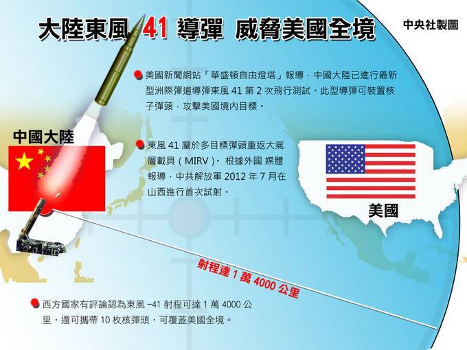 我們都知道東風41是洲際飛彈,其目標是美國不是台灣,大陸對付台灣只須用東風11及東風15飛彈,台灣的國安人士指出,隨著中共國力成長及航天技術快速發展,其彈道飛彈研發能力,確實帶給西方及亞洲國家很大的壓力,所以台灣的國防官員應體認太空航天技術與發展飛彈兩者關係,台灣花600億台幣天價買30架阿帕契直升機並不能提升台灣的國防力量及國際地位,但若集中力量發射衛星及長程飛彈,則可有效提升嚇阻敵人力量及國際地位。南韓發展“羅老”號火箭發射人造衛星,整個工程耗資約5億美元,台灣向美國買軍火的錢一小部分就可支持此太空計畫,台灣國防的困境要突破應學南北韓的戰略發射衛星以發展長程飛彈。