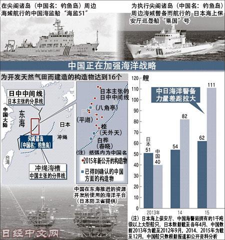目前中國大陸的經濟規模已超過日本幾乎1倍,而維護海上治安的警備力量也超過日本,中國迅猛增加海監船的情況,與中國擴大軍事基地的南海相比,東海看起來勉強保持了穩定,但在私底下,嚴峻事態仍在形成。中日具備的海上警備力量出現逆轉,並正不斷拉開差距。不僅是海軍力量,中國同時還在迅速增強海警艦隊,未來東海的力量對比有可能有利於中國。截至2013年前後,日本仍佔據優勢。但到2014年,日本為54艘,中國則達到82艘,中日發生逆轉。到了2015年,日本增至62艘,而中國達到111艘,日本被遠遠甩開。 2016年以後,預計差距將進一步擴大。