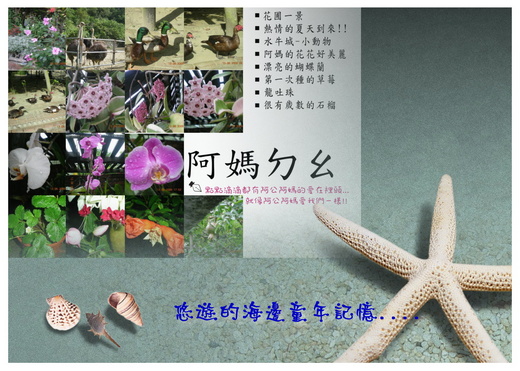 當強褓中的妳從醫院直接帶回阿媽家坐月子開始,由阿媽照顧妳,從懷中抱著妳、慢慢的開始翻身、學爬行、舉起小腳開始邁向第一步......,港口的環境一直是妳的生活方式,曾幾何時也8歲了,中間面臨了疼愛妳的阿公離開我們,你堅強陪著阿媽繼續生活著,想想這對你來說是多大的打擊,阿媽依舊細心的照顧著妳,大班在7/31結束,刻意沒讓你上所謂的暑期班,為的就是讓妳盡心的享受童年,8月份就讓你跟阿媽與妹妹整天玩在一起!!