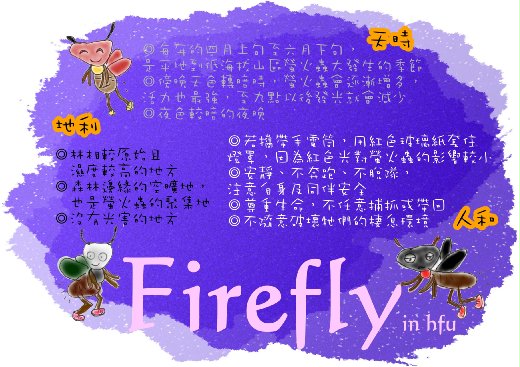 2.為了明年還能有更多更多的螢火蟲,請好好的愛護牠們,不要隨意的帶走牠們,並一起維護環境清潔。