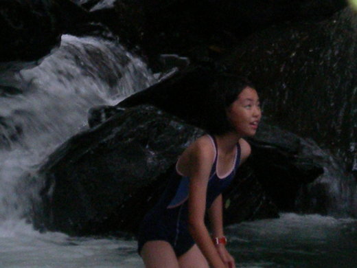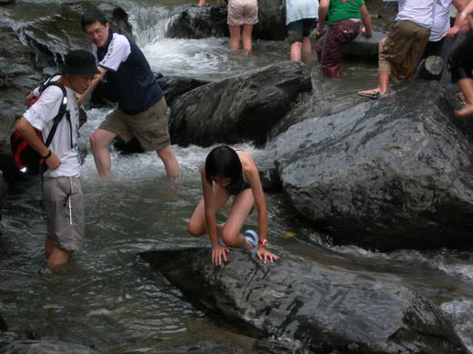 下午去新寮瀑布,我把泳裝穿在T恤裡,一到溪邊,T恤一脫,爬石頭、打水仗,讓旁邊忙著捲褲管,擔心衣服濕了沒得換的同學羨慕得不得了,哈哈,這叫做有先見之明。