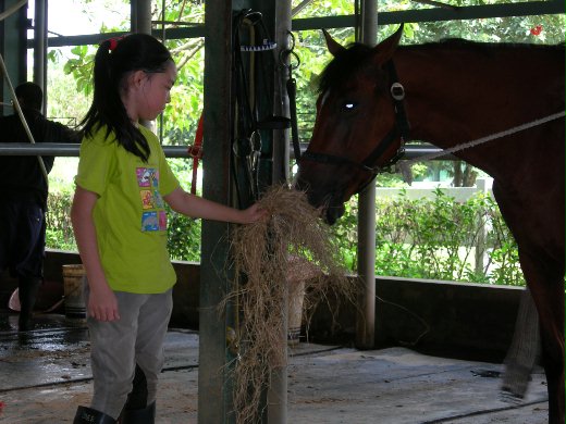 在格蘭地,我學習如何照顧馬兒,備馬、餵食,還幫著教練一起替馬洗澡。我意外發現,體型大的馬,竟然會欺負迷你馬;教練說,馬和人很像,也會有好心情和壞心情的時候呢。