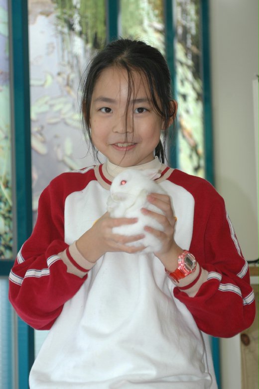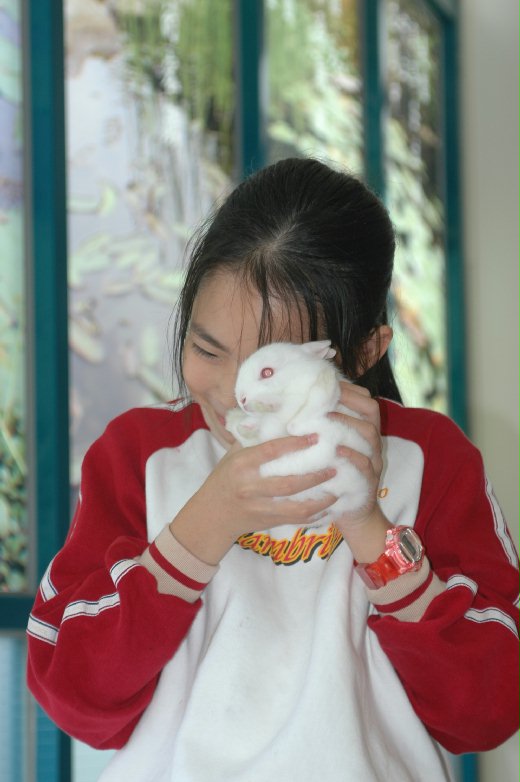 一下課,我衝到研究部前的窗口,鼻子貼上去看個究竟。突然,那團毛球站了起來,啊,原來是隻兔子。牠看了看我,又趴下睡牠的大頭覺。我有點不滿,心想:我專程來看你,你怎麼都不理我呢?