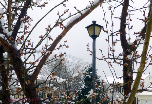 今晨瑞雪又紛飛, 蓓蕾薄冰互倚偎。