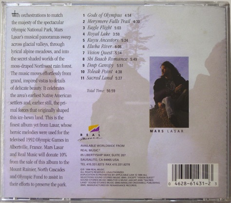 這張專輯的名稱是「The Music Of Olympic National Park」作者是 Mars Lasar,這系列是以美國國家公園為主題的純音樂,在大學時代還曾發現一般唱片行中有發售台版的版本,想必應該是賣得還不錯吧。其實音樂是個主觀的事物,每個人都有屬於自己的觀感,當然也不會有什麼音樂類型會是所有人都喜歡的,只是我會用自己的語言來表達我對這些音樂的看法。如果喜歡的話,希望大家可以去買幾張來收藏,這絕對是買了不會後悔音響發燒樂。廢話不多說,以下開始介紹此張專輯的曲目。