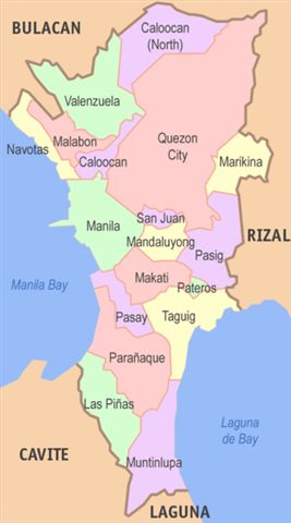 菲律賓首府馬尼拉,英文稱為Metro Manila,面積636平方公里,人口一千一百二十八萬,是全球人口最密集的大都會之一,劃分成四大地區(District),第一區是原來的馬尼拉市(City of Manila)。其他三區由十六個城市(City),合組成現在的Metro Manila,是菲律賓全國七十九個省中的「國家首府行政區」(National Capital Region)。