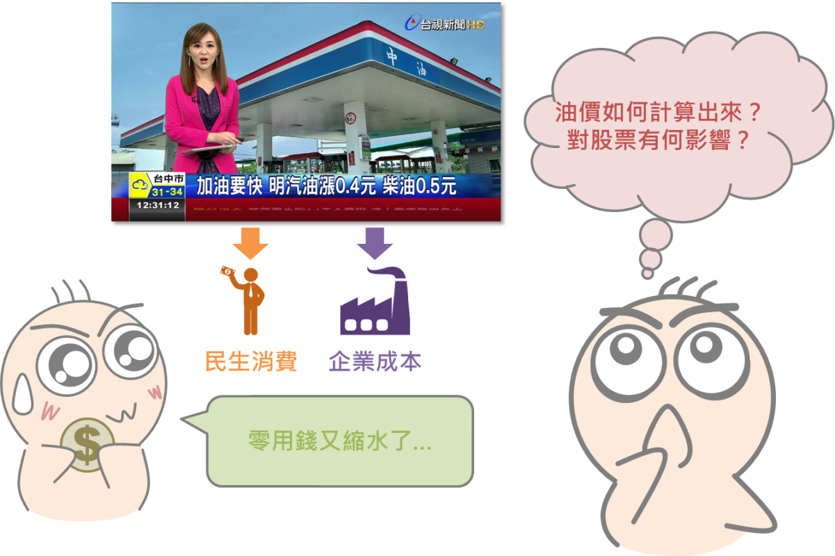 「加油等等,明中油調降汽油每公升0.3元。」有在開車或騎車的夥伴,對於這樣的報導應該一點都不陌生,每個禮拜天晚上都會出現類似的訊息在新聞下方跑馬燈。其實油價的波動,不僅牽連市井小民的民生消費,更直接影響許多產業的成本結構,進而帶動整體環境的景氣變化,然而油價到底是怎麼訂出來的?對於投資人又會有什麼影響呢?