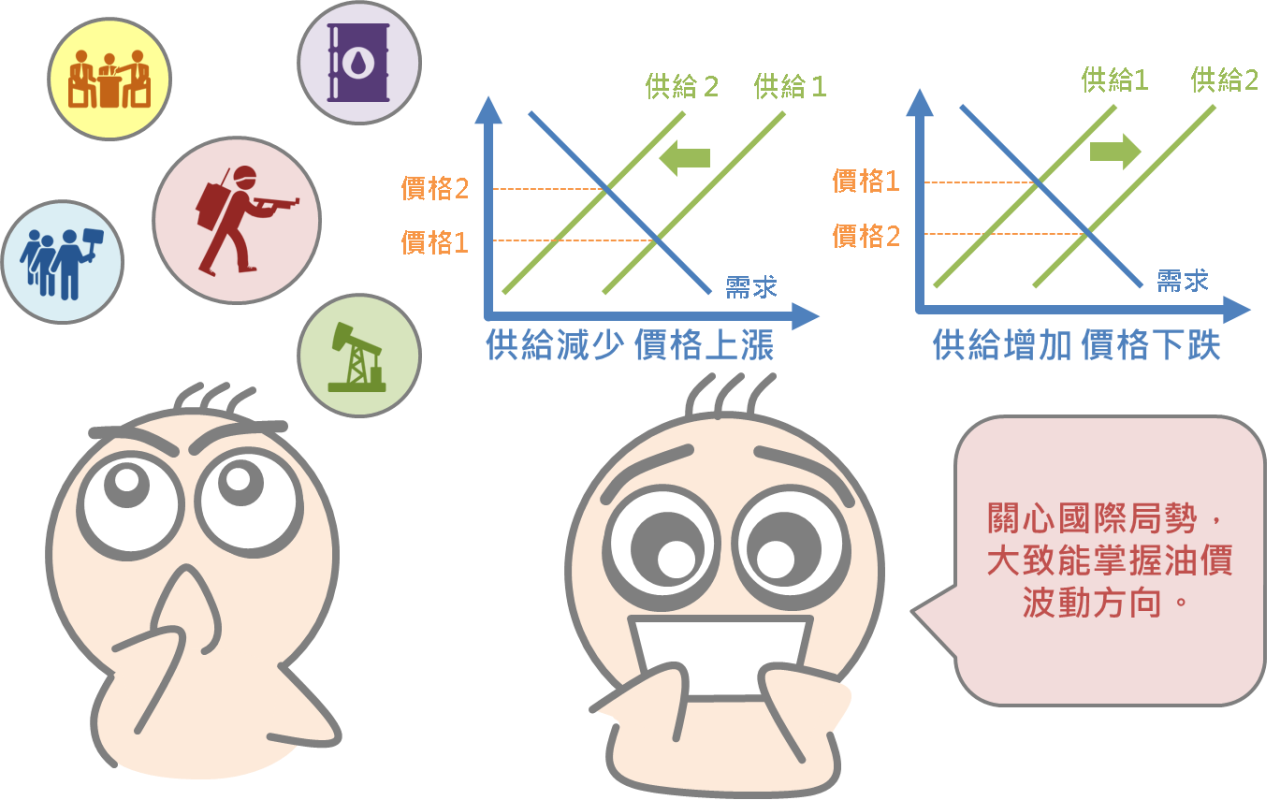 影響國際油價的因素當然不可能只有上述這兩種情況,不過基本上不會脫離供需機制,供給增加、需求減少,會使價格下跌,供給減少、需求增加,則會激勵油價上漲,因此只要平時有在關心國際局勢新聞,就算不透過公式計算,也能夠大致抓準油價變化的趨勢囉!