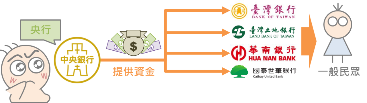 央行全名為中華民國中央銀行,是台灣貨幣政策的主體機構,也是唯一的貨幣發行單位。雖然也稱作銀行,但它是銀行的銀行,並不借錢給一般民眾,而是提供資金給其他銀行,例如臺灣銀行、土地銀行、華南銀行、國泰世華銀行等。
