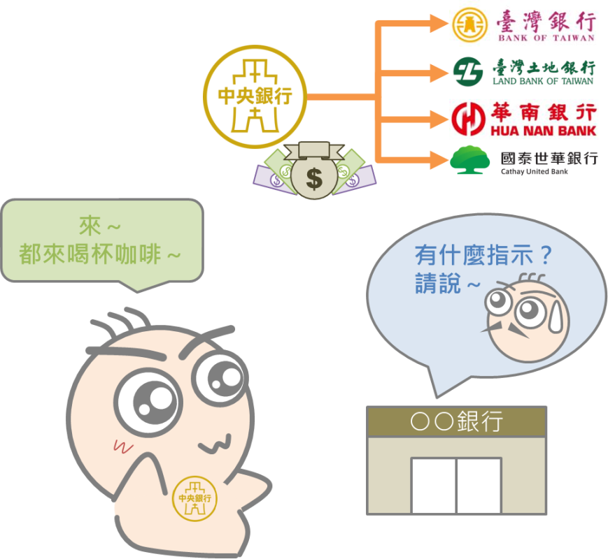 除了擁有硬性、規範性的權力之外,央行也可以透過軟性道德勸說的方式,請其他銀行配合政策進行調整,也就是常聽見的央行請銀行主管「喝咖啡」這件事,喝咖啡聽起來很輕鬆、沒壓力,不說清楚,或許還真的有人不瞭解什麼是央行請喝咖啡。其實只要想想看,對一般銀行而言,央行算是他們的債權人,債權人突然哪天邀自己去他家喝咖啡,光收到邀請就夠驚悚了,更別說喝咖啡時他給的建議、提醒,誰敢當作耳邊風呢?