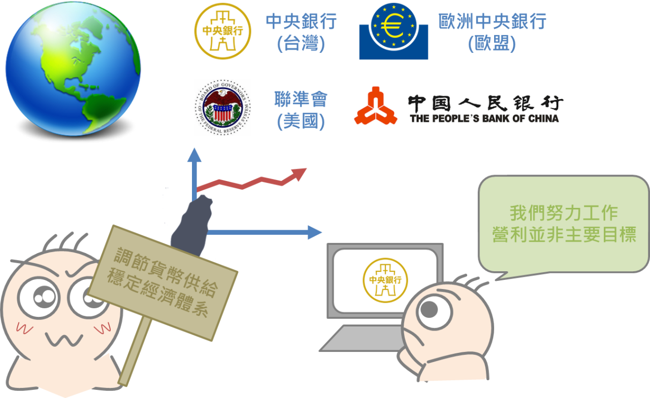 在全球各國中,雖然名字不盡相同,但都有類似央行的機構,例如美國的聯邦儲備系統(又簡稱聯準會)、歐盟的歐洲中央銀行、大陸的中國人民銀行等,他們主要的職責與一般商業銀行不同,並不以營利為主要目的,而都是以審慎調配國家或特定區域的貨幣供給、穩定整體市場為首要目標。