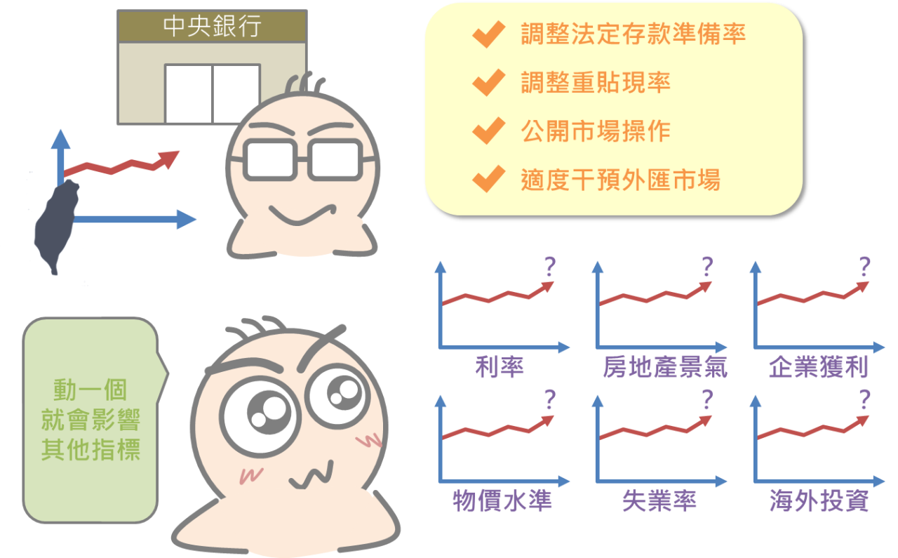 央行為了穩定經濟體系,可採用的方式相當多元,例如調整法定存款準備率、調整重貼現率、公開市場操作或適度干預外匯市場等,然而「牽一髮而動全身」可說是央行對於經濟體系影響的最佳解釋,往往一個政策就會帶動其他副作用。