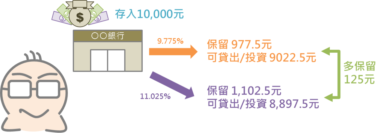 以前述法定存款準備金為例,目前央行針對活期存款的法定存款準備率為9.775%,表示民眾存入銀行1萬元,銀行必須至少保留977.5元作為準備金,剩餘的部分則可以再借貸出去,或進行投資。假設央行覺得目前景氣過熱,想收回部分流通在外的貨幣,而將準備率調高至11.025%,銀行就必須多保留125元在行內,如此一來就能夠減少流通在外的貨幣數量。