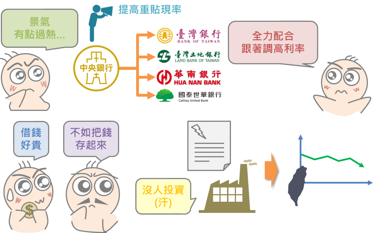 央行一旦想透過升高重貼現率來收回過多流通貨幣時,首先一般銀行就必須配合提高利率,而利率的提升,一方面增加企業借貸的成本,另一方面也會使得部分流通在外的資金流回到銀行進行儲蓄,而這些資金可能包含了原本其他投資市場中的金錢,使得企業更難以獲取足夠資金來擴大發展。最終,雖然央行可以順利的收回流通在外的貨幣,但也會間接影響整體產業與股市的景氣。