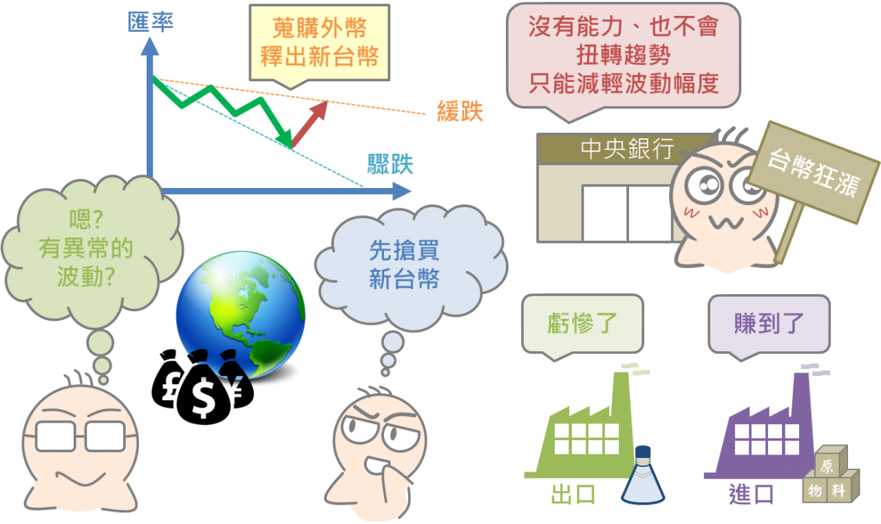除此之外,如果一個國家或區域的經濟體系是封閉的,那央行的職責或許會單純許多,然而現實狀況卻不是這樣,民眾與企業都可以自由購入或賣出外幣,更不用說國際間有許多投機客想伺機大量炒作匯率,都加深了央行穩定貨幣的難度。