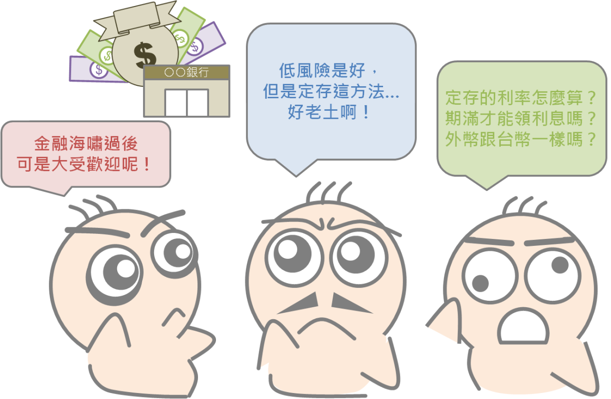 在所有投資方式當中,最沒有風險的方式是定存,或許這方法聽起來收益性很低、很老土。是的,它的收益性確實不高,然而卻在金融海嘯過後,重新被投資人列為最重要的投資方式之一,畢竟除了銀行倒閉,否則還真不太會產生其他的風險;另一方面,雖然它是很老土的投資手法,但是還是有很多人並不完全清楚它的遊戲規則。本次的新手教室就與各位介紹,在防禦型投資中,最具代表性的方法:定存。