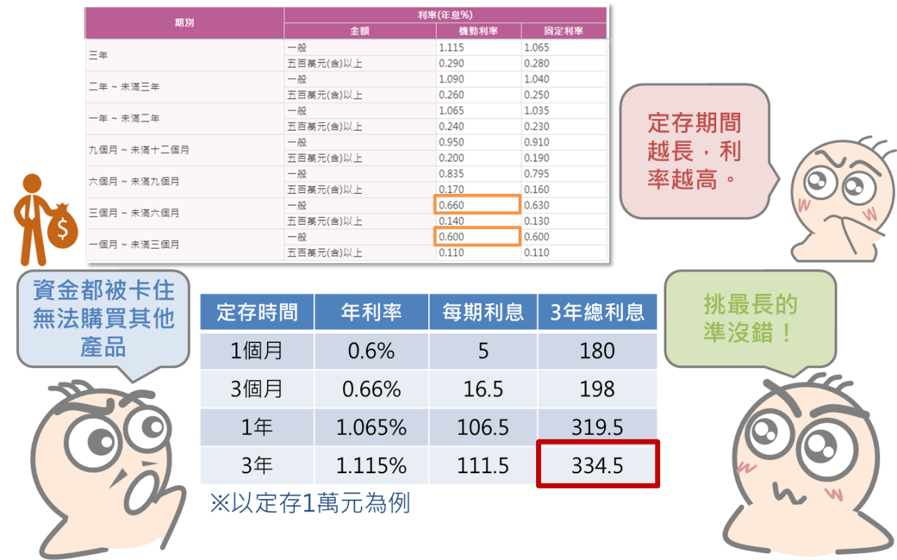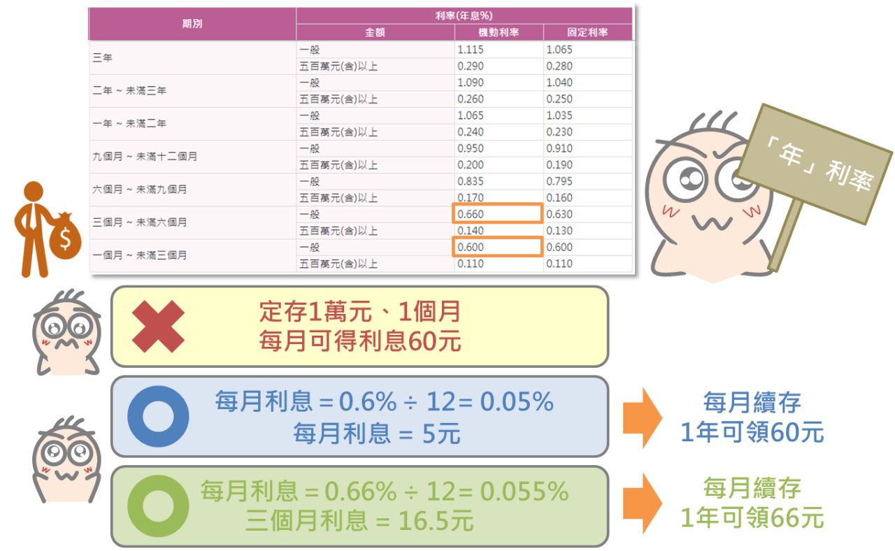 台灣目前正處於低利率的時代,一般定存年利率大約只有1.065%左右,然而有時候到銀行辦事,經常可以看到櫃台牌價顯示1個月定存利率0.6%,不禁在心中想:「一個月就有0.6%的利息,那我存兩個月不就有1.2%了嗎?這樣就比存一年收益更多了欸!?」