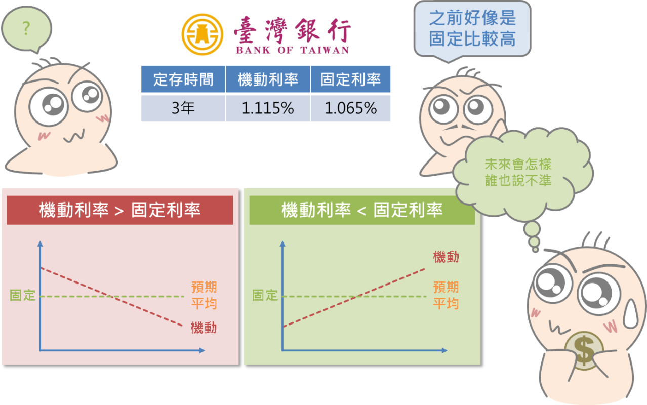 有趣的是,有時候固定利率與機動利率並不相同,以目前台灣銀行3年期定存為例,機動利率為1.115%,稍高於固定利率的1.065%,不過這只是現在,有時會相反,反而是固定利率比機動利率高一點,這是為什麼呢?這主要是因為銀行對於後續利率變化的看法不同,若機動利率稍高於固定利率,表示台灣銀行認為在存續期間,利率調降的可能性較高,後續可能會因央行調降利率,使機動利率跟著下降,而低於固定利率,最後使得二者整體收益趨於一致,不過未來實際上是否真的按照劇本走,其實也沒人說得準,就看投資人如何選擇囉。