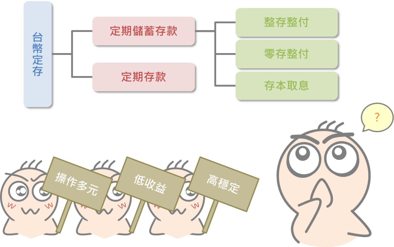 定存除了具有高穩定、低收益的特點之外,還有幾種不同的玩法可供投資人做選擇,分別是定期儲蓄存款與定期存款,而定期儲蓄存款又可以因存入本金及領取利息的方法不同,細分為零存整付、整存整付和存本取息三種。