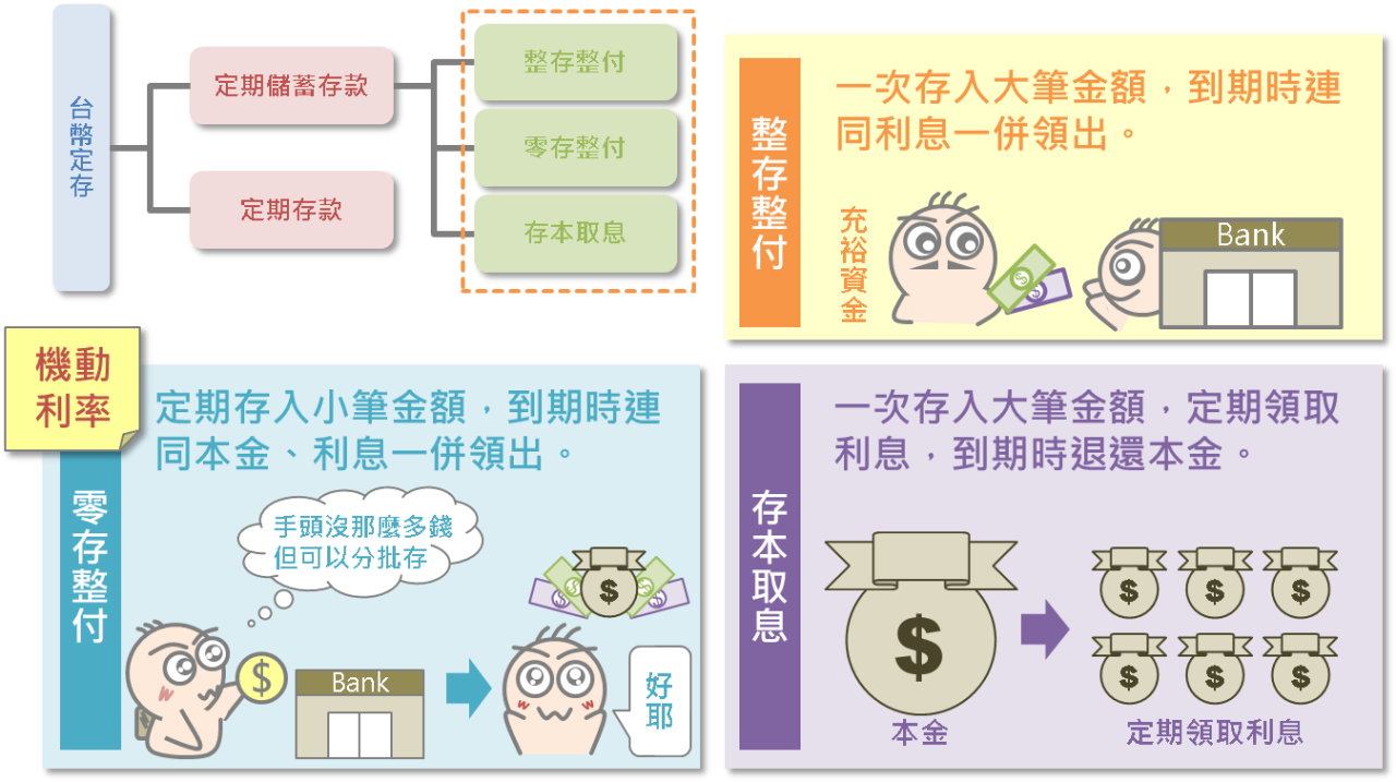 至於整存整付、零存整付和存本取息三種方式,雖然念起來很饒舌,但是其實概念很簡單。所謂的整存整付,是指一次就存入想要定存的金額,等到到期時連同本金和利息一起領回,這種方式比較適合目前手頭上就已經有大筆資金的投資人;至於目前手頭上沒那麼多資金,但想要強迫自己每月固定儲蓄的投資人,則可以選擇零存整付,每月固定儲蓄一筆金額到戶頭內,到期時再連同本金及利息領出;而所謂的存本取息則是在一開始就存進一大筆金額,然後每月領取利息,到期時再領回本金,非常適合退休族群當作領取固定生活費的方式。