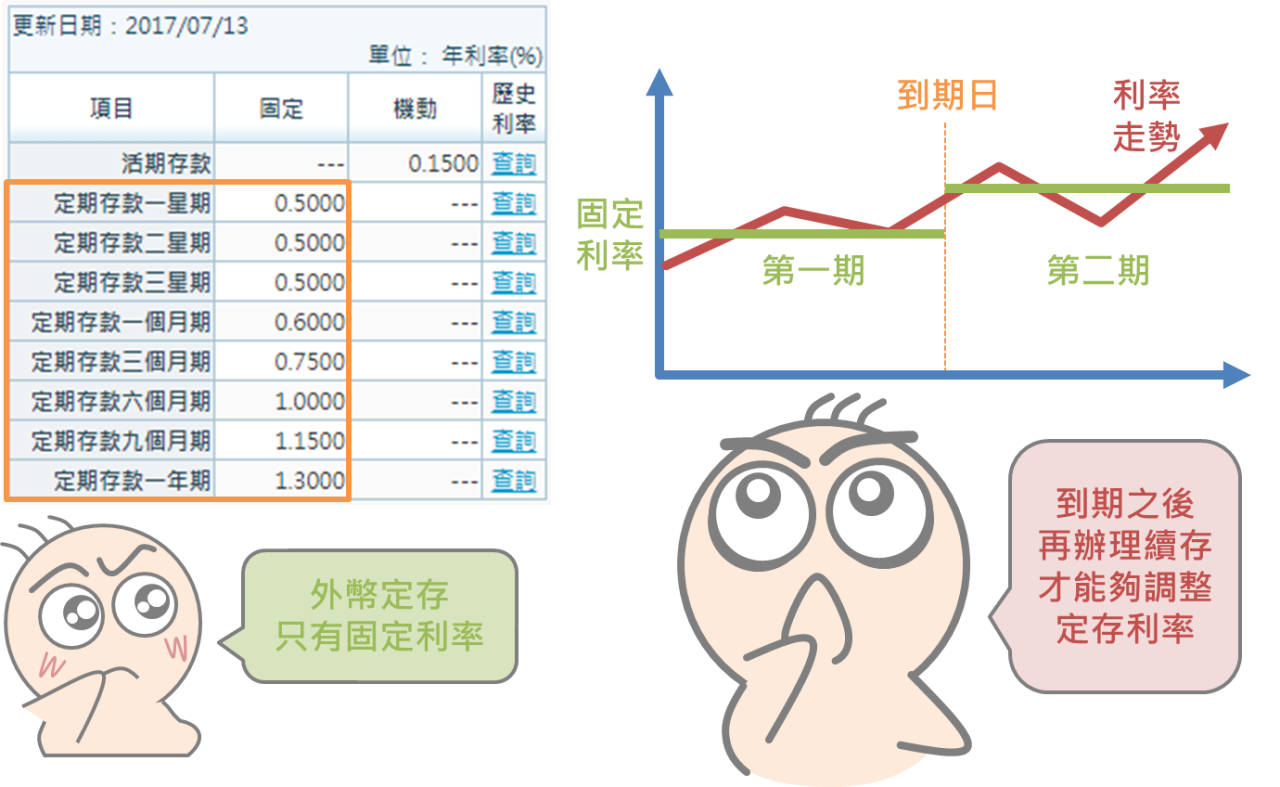 而在利率方面,外幣定存也不像台幣定存可選擇機動或固定利率,都是採取固定利率來計息,倘若存續期間遇到該國調升或調降利率,也必須等到到期日後,續存才會重新以新的利率進行計算。