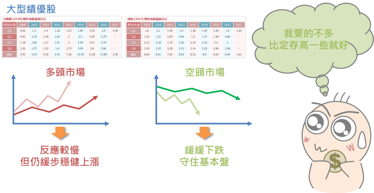 對於許多保守型的投資人而言,求的並不是快速取得大量財富進帳,而是期盼在工作之餘,能夠將資金放置在一個比定存利率高一些的地方。因此建議這類型的投資人可優先鎖定大型績優股,諸如台積電、鴻海等,這些企業每股盈餘往往都可以達到3元以上。而且這類型的股票雖然在多頭市場來臨時,股價並不會馬上、劇烈的上漲,但是在之後還是能夠穩穩的漲上來,相反的,當市場一片看空時,也不會像一般小型股迅速應聲倒地,而是緩緩下滑,守住一定的基本盤,因此十分推薦給不願意承擔過多風險,或沒空研究股票的投資人。