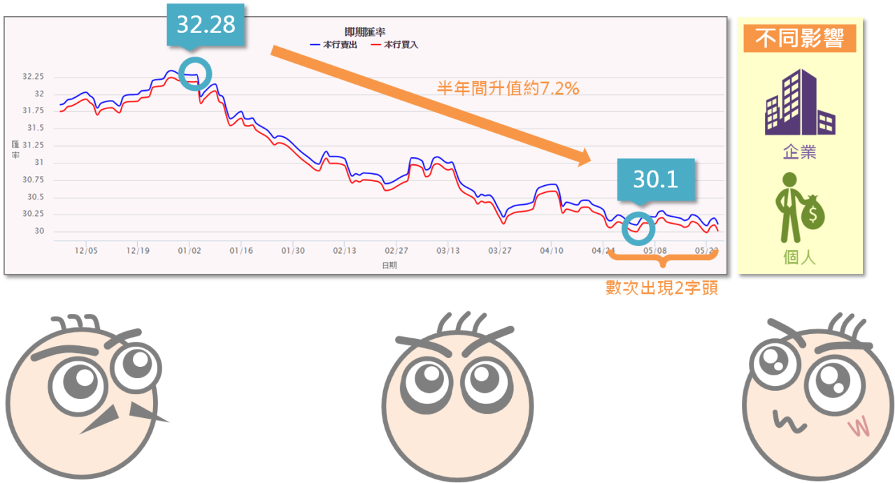 自去年起台幣就不斷升值,以台幣兌美元為例,從今年年初時的1:32.28,至5月已變為1:30.1,短短4個月間就強勢升值約7.2%,更於4月底至5月初這段期間數次於盤中達到2字頭,成為自2014年以來首見。而台幣這波升值的行情,對於民眾、對於企業都有著不同的影響,可以說是幾家歡樂幾家愁,本次新手教室就與各位說明匯率波動的成因、衍伸的影響,以及換匯的實用技巧。