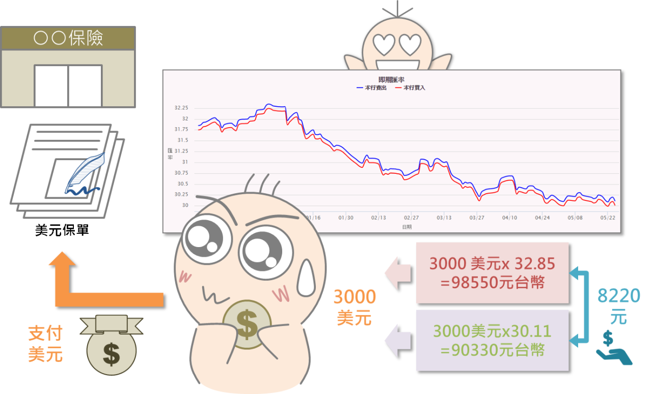 除此之外,近年來許多儲蓄或醫療險,都是以美元來進行交易,因此投保民眾固定隔一段時間就必須買進美元以支付保費,當台幣升值時,對這群人絕對是好消息,以一年需繳納3000美元保費的家庭而言,去年5月中台幣兌美元為32.85元,近期則降至約30.11,二者換算為台幣就相差了8,220元。
