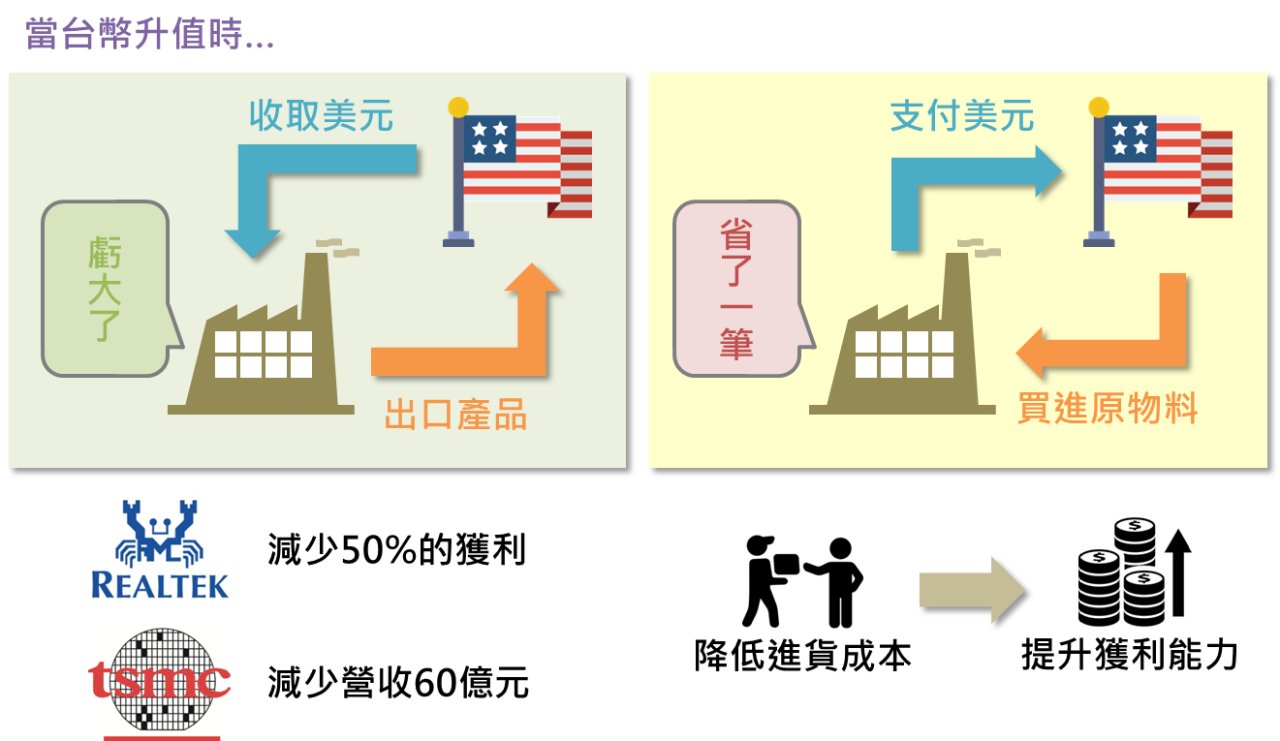 至於對於企業的影響呢?受到近期台幣不斷升值的影響下,將會使以外銷為主、收取外幣的企業蒙受匯兌損失,例如受到台幣在今年第一季大幅升值的影響,瑞昱就因匯損吃掉約50%的獲利,台積電也因此減少營收達60億元。不過相反的,如果一間企業主要由海外進口原物料,就容易因為台幣升值、進貨成本降低,而提升獲利能力。