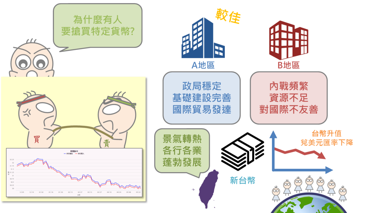看似簡單的供需原理,但投資人必須深入探討的是:「為什麼一種貨幣會被投資人爭相購買?」其背後的原因相當多,主要還是在於貨幣流通地區,有著相對值得投資之處,因此吸引國際投資客紛紛兌換該幣種加碼投資。