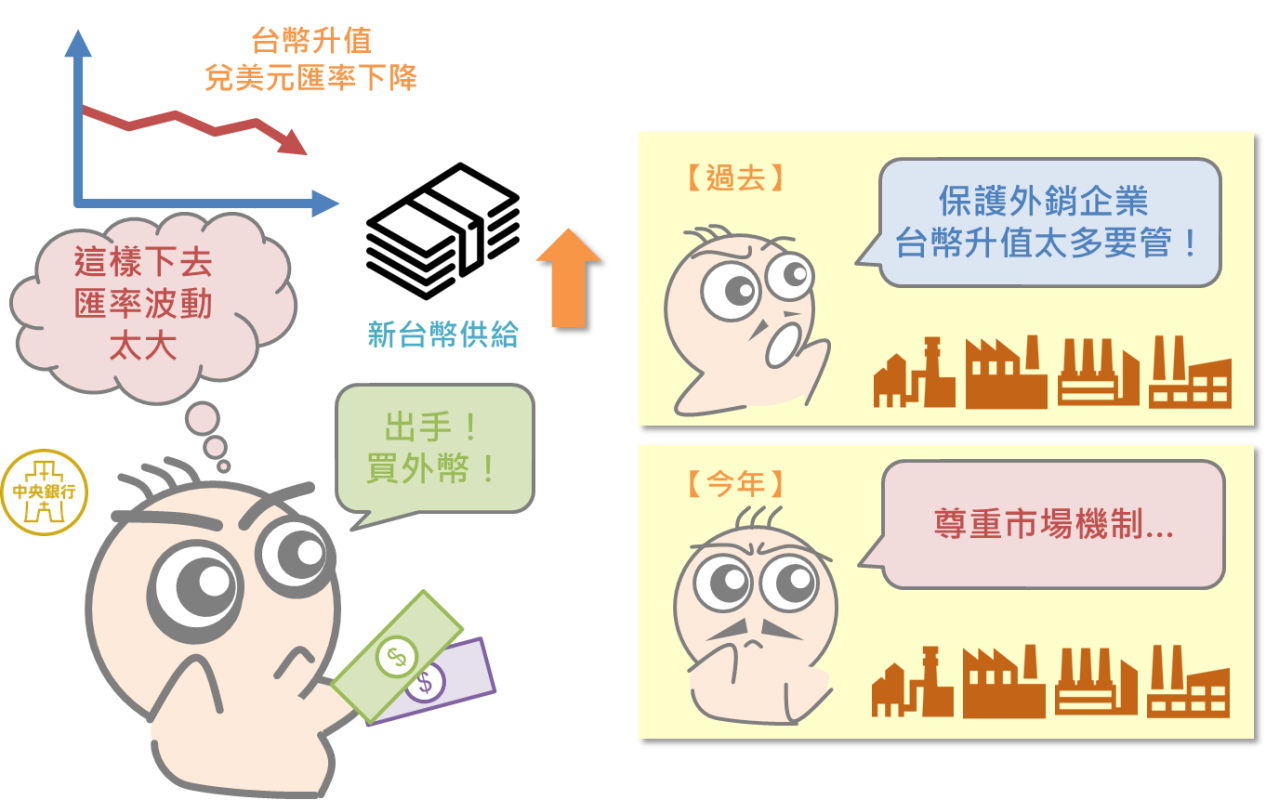 舉例來說,當台灣景氣轉熱,各行各業正處於蓬勃發展的階段,或者是台灣利率偏高,很容易吸引國際間的投資者挹注資金,當豐沛的外幣湧進、搶買台幣時,使得國際市場對台幣的需求量大幅提升,自然會造成台幣升值的態勢。