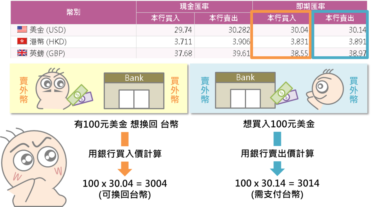 舉例來說,假設小編想將手上的100元美金換回台幣,此時銀行會以買入價30.04元來計價(由銀行買入美金),故小編可換得3,004元台幣;相反的,如果小編此時想買入100元美金,銀行則改以賣出價30.14來計算(由銀行賣出美金),小編必須支付3,014元台幣來兌換。