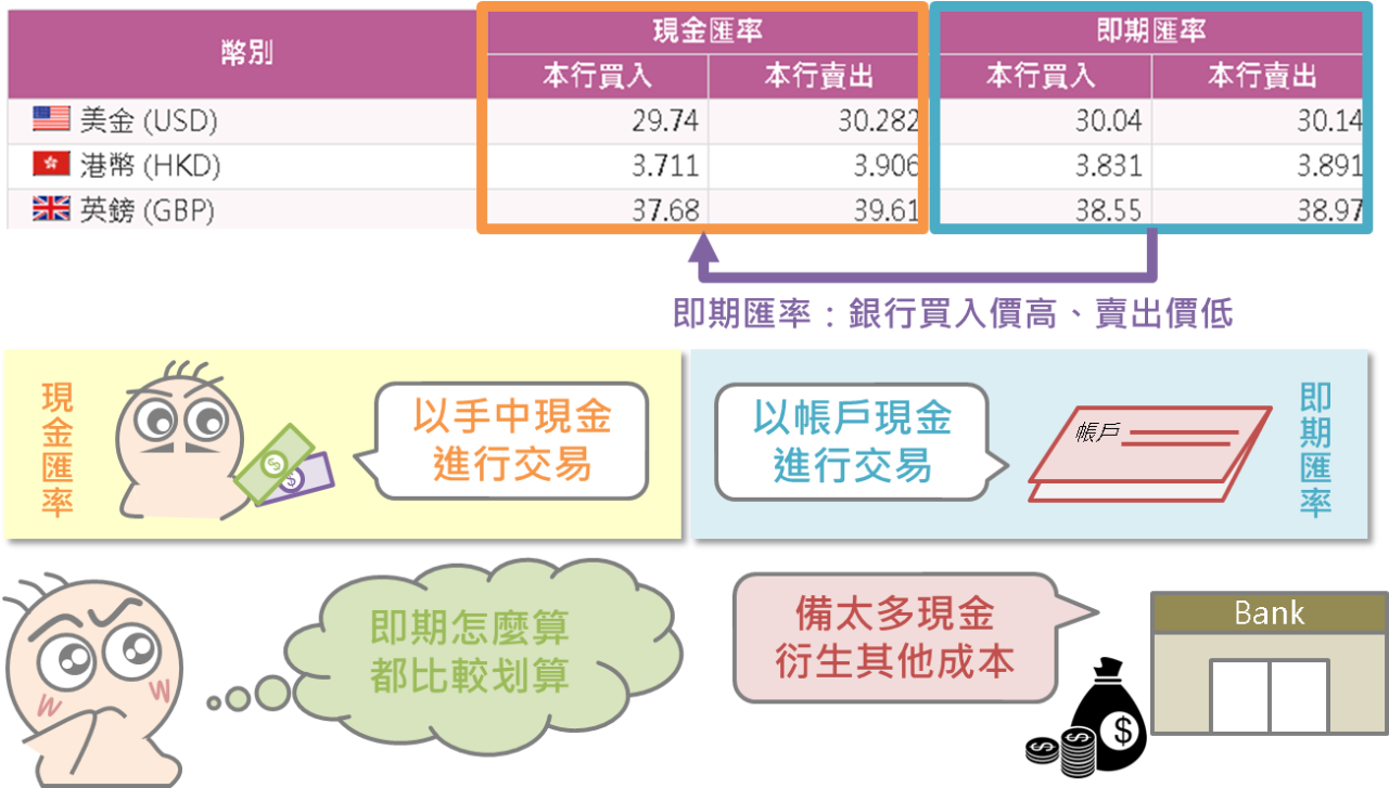 對一般民眾而言,無論是買入或賣出外幣,採用即期匯率往往都是比較划算的,主要原因在於銀行持有現鈔會增加一定的成本,因此即期匯率往往對民眾是比較有利的。