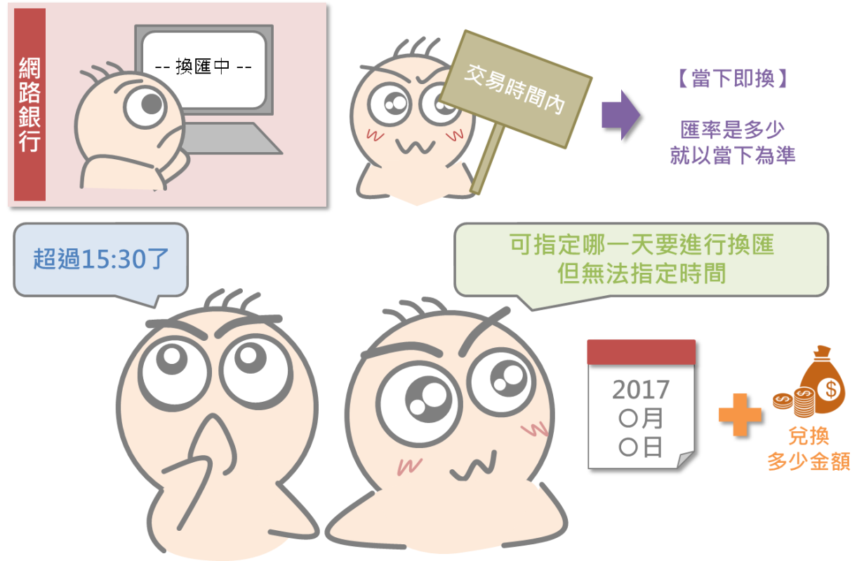 不過必須提醒的是,在每天交易期間過後才在網路銀行操作換匯的話,最多只能限定在哪一天安排換匯,還沒有辦法指定幾點幾分進行換匯,這與在交易時間內辦理,絕對採當下匯率計價是不太一樣的。