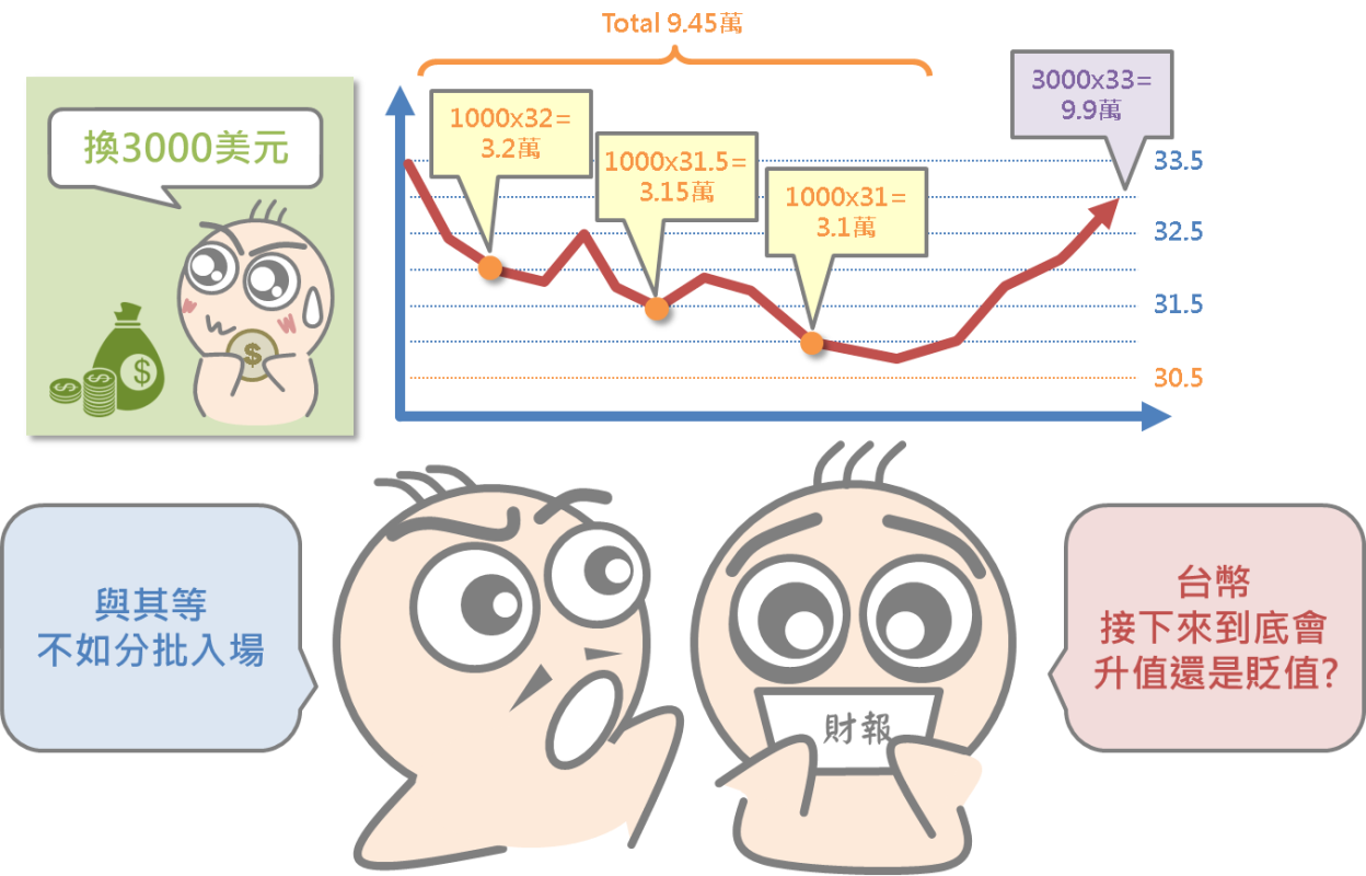 同時由於誰也無法100%預測匯率變化,因此建議可嘗試分不同價位、分批買進外幣的方式,例如小編今年需繳納3,000美元的儲蓄險費用,假設目前匯率為33.5元,設定非得要等到1:30.5才買進,最後因為一整年都未達到這個目標,所以最後還是會被迫以當時的33元買進。但是如果小編採取分批買進的方式,在32、31.5及31元時分別買進1,000美元,雖然比起原本理想的30.5元還貴,但就結果論而言還是省下台幣4,500元,算是一種分散風險的方式。