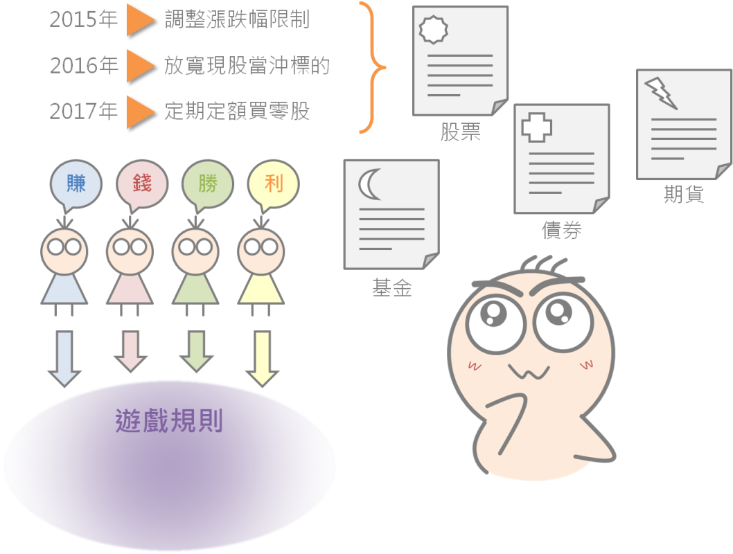 想要贏得一場比賽,就必須瞭解他的遊戲規則。在台灣,不論是證券、期貨、基金或債券,都有各自的遊戲規則,而且它們並非恆久不變。以投資股票為例, 2015年調整漲跌幅限制、2016年放寬現股當沖交易標的,今年也有可能正式施行定期定額買股票的新制,這些都會影響投資人進出場的決策。